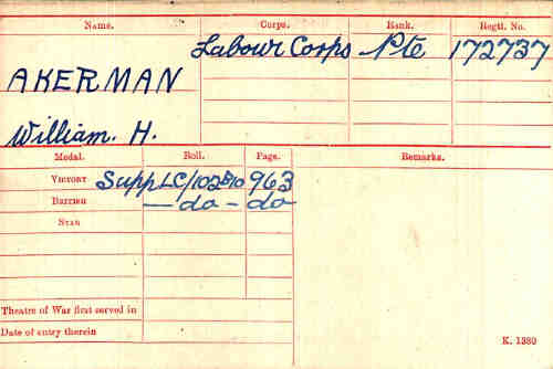 ![]() • Military Service: Enlisted, 10 Nov 1916, High Street, Oxford. 1 Enlisted into the Royal Berkshire Regiment, Sevice No:- 7167. Posted to the Labour Corps, sevice No:- 172737, 23 Mar 1917 |